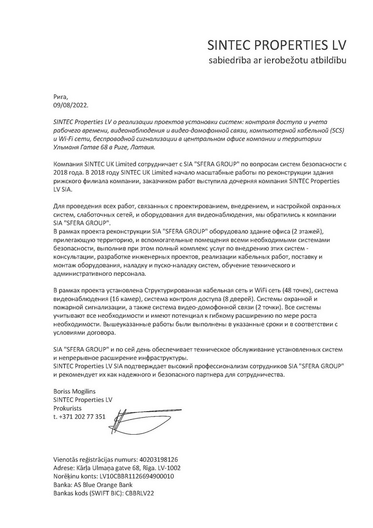 “SIA SFERA GROUP continues to provide technical maintenance of the installed systems and the ongoing expansion of our infrastructure. SINTEC Properties LV SIA confirms the high professionalism of SFERA GROUP’s staff and recommends them as a reliable and secure partner for collaboration”